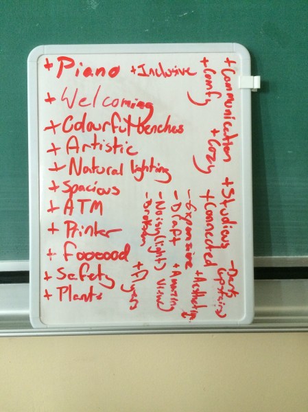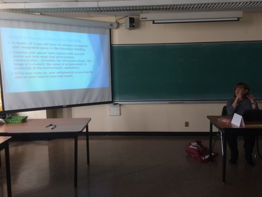 Sheryl Smith-Gilman, a professor at McGill who teaches Communication in Education had her students do an exercise in which they discover the Education Building, floor by floor. A proponent of The Reggio Emilia approach (a student-centred philosophy that deeply considers the role of relationship and place in learning for preschool and primary schoolchildren), Smith-Gilman encourages her students to think about how and what environments communicate by their particular features and how educators can adapt to and appropriate these in order to create spaces that become more conducive to learning – by considering how we occupy these sites. The exercise points to an initial appropriation of space: observe what you see; what is there; what can be utilized, what can be added to or subtracted from; what is available and what is ready for setting up your “holistic” learning environment. Starting from an embodied reception of place (i.e.: more closely observing how a particular place makes us feel, exactly as it is) we can then go in and propose changes. Which can be quite subtle and relatively simple (more intimate seating arrangements, adding cushions, plants, student-made art on the walls, etc.).